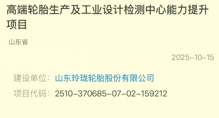 【炭黑產(chǎn)業(yè)網(wǎng)】10月18日消息,國內(nèi)輪胎行業(yè)龍頭山東玲瓏輪胎股份有限公司于10月15日完成一項(xiàng)重要投資項(xiàng)目備案,該動(dòng)態(tài)迅速引發(fā)資本市場及行業(yè)內(nèi)的廣泛關(guān)注。此次備案的"高端輪胎生產(chǎn)及工業(yè)設(shè)計(jì)檢測中心能力提升項(xiàng)目"由公司董事長王鋒親自出任項(xiàng)目法人,這一安排凸顯出玲瓏輪胎在推進(jìn)產(chǎn)品結(jié)構(gòu)升級與研發(fā)體系強(qiáng)化進(jìn)程中的戰(zhàn)略決心,為企業(yè)高端化發(fā)展路徑再添關(guān)鍵注腳。
