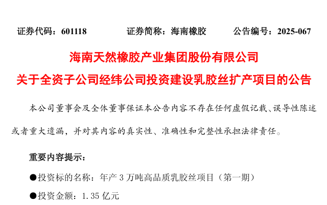 海南橡膠產業集團股份有限公司(證券代碼:601118,簡稱“海南橡膠”)10月31日發布公告稱,公司全資子公司海南經緯乳膠絲有限責任公司(簡稱“經緯公司”)擬投資1.35億元建設年產3萬噸高品質乳膠絲項目(第一期)。項目建成后,經緯公司乳膠絲年產能將新增1.5萬噸,進一步鞏固其行業龍頭地位。