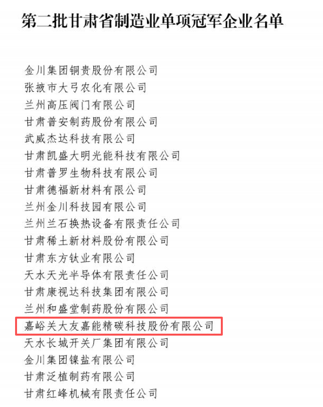 近日,甘肅省工業和信息化廳公布第二批省級制造業單項冠軍企業名單,20家企業入選,嘉峪關大友嘉能精碳科技股份有限公司榮登榜單。